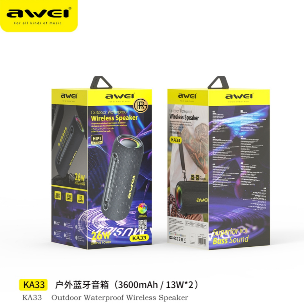 The Awei KA33 Bluetooth Dynamic RGB Outdoor Speaker is built to deliver powerful sound, eye-catching visuals, and reliable performance for both indoor and outdoor use. Featuring a 26W high-output audio system, this speaker produces rich bass, clear vocals, and balanced highs, making it perfect for parties, travel, camping, and everyday music listening.
