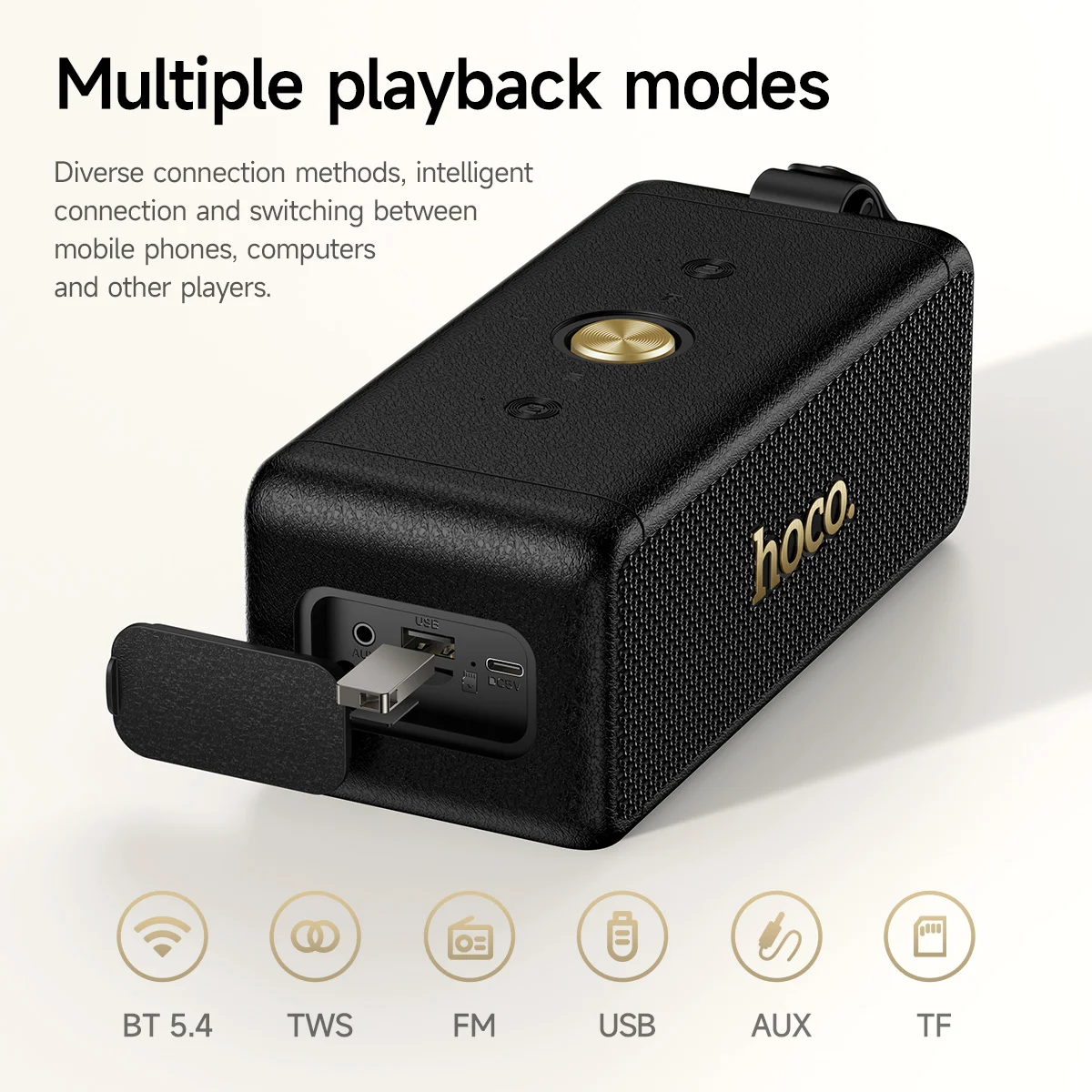 Powered by Bluetooth 5.4 with the Blue Trum AB5606P chipset, the Hoco HT1 Pro ensures fast pairing, stable connectivity, and smooth wireless streaming. Beyond Bluetooth, it supports multiple playback modes, including TWS pairing, FM radio, USB flash drive, TF card, and AUX input, giving you total freedom to enjoy music your way.